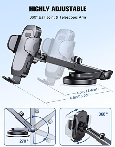 【Infinite Viewing Angle & Extendable Long Arm】: The mobile holder for car has a highly flexible 360° rotation ball-joint that provides infinite viewing angles. The telescopic arm can extend from 4.5″ – 6.5″ with just one hand operation and pivot up or down for optimal viewing capabilities. You can enjoy a safer and more relaxed driving experience while position your phone at a desired angle or visual distance!