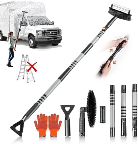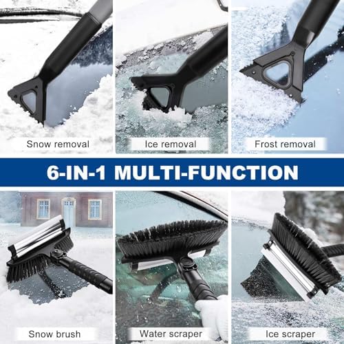 【270° Pivoting Head&Extendable】The brush head can be rotated 270°,allowing you to lock it in a horizontal, vertical, or any desired angle , our snow scraper with extendable multi-section adjustable length rod (65″ to 72″) offers ultimate convenience and flexibility, allowing you to remove snow from any angle and making the snow removal process much easier No more struggling to reach difficult areas