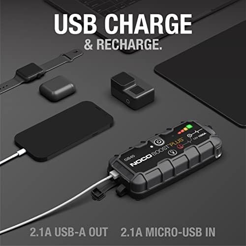 In The Box – GB40 UltraSafe Portable Car Jump Starter, Heavy Duty Booster Clamps, 12-Volt Car Charger, Micro USB Charging Cable, Microfiber Storage Bag, User Guide, 1-Year Warranty, and Designed in the USA.